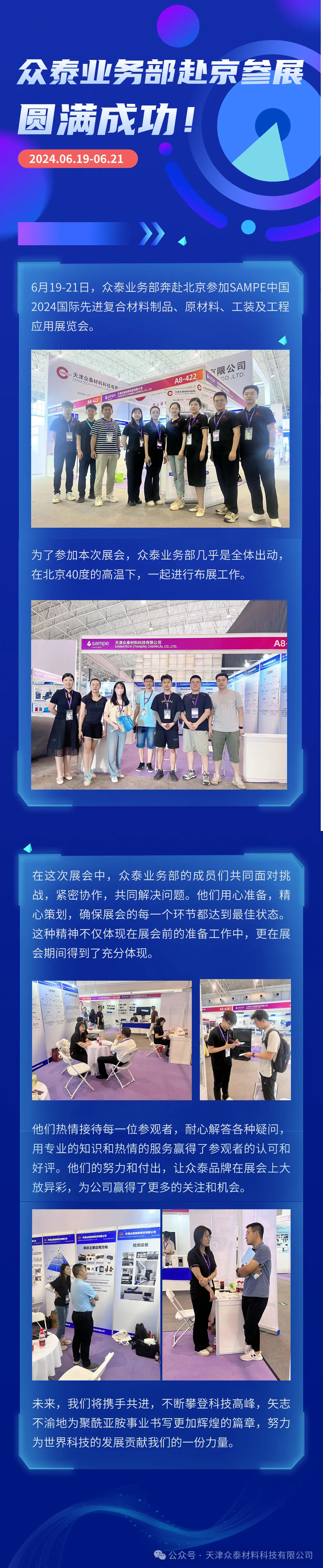 6月19日-21日,眾泰業(yè)務(wù)部奔赴北京參加SAMPE中國(guó)2024國(guó)際先進(jìn)復(fù)合材料制品、原材料、工裝及工程應(yīng)用展覽會(huì)。在這次展會(huì)中,眾泰業(yè)務(wù)部的成員們共同面對(duì)挑戰(zhàn),緊密協(xié)作,共同解決問(wèn)題。